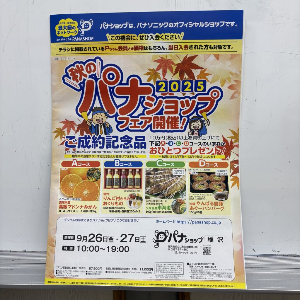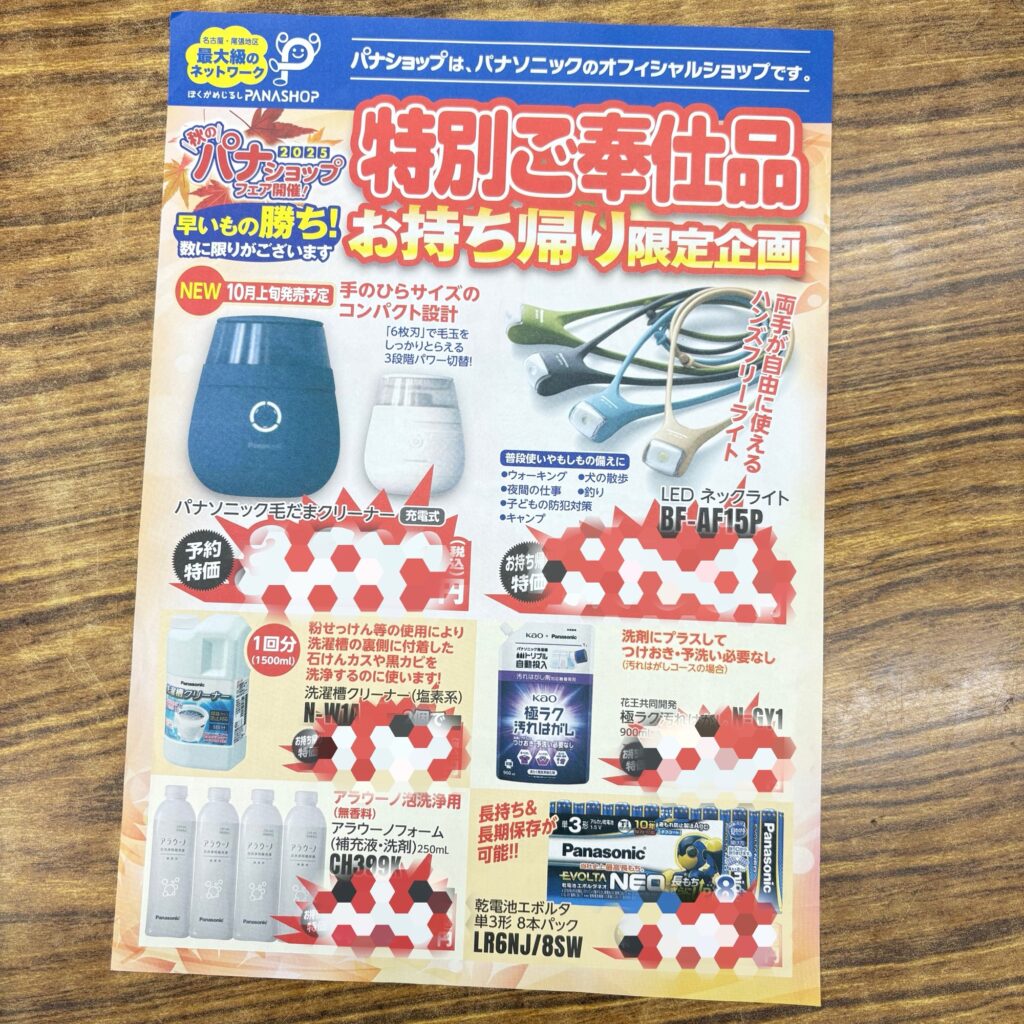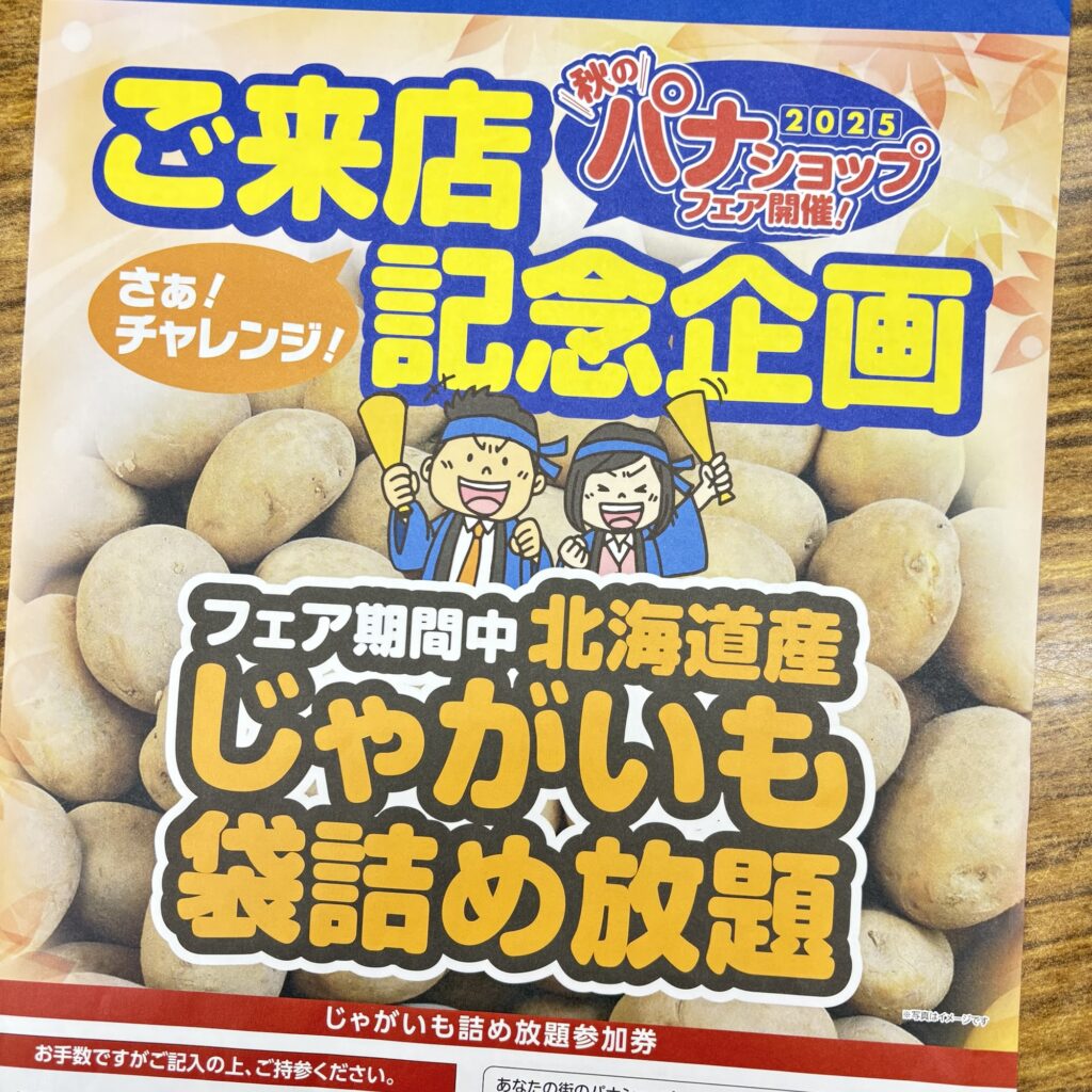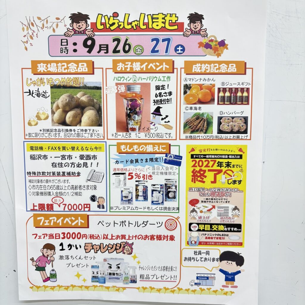 お世話になります! 9月26日~27日の2日間当店にて秋のイベント開催致します。 来場記念品は北海道のじゃがいもです。毎年恒例、好評頂いております。 新商品の毛玉クリーナーから電池も大変お買得となっております。 お子様イベントはハロウィンハーバリウム作りです。(限定6名さま) 簡単なご紹介となりましたがデジタル商品から生活家電、照明器具などお買得品盛りだくさん。ご来店お待ちしております。 イベント案内 LEDベースライト、LED照明 売り出し 売り出し、イベント、フェア URLをコピーしました! 短縮営業のお知らせ 補聴器相談会 関連記事 補聴器相談会 2025年10月2日 夏のパナソニックフェア 2025年6月27日 5月23日24日夏さきどりフェア 2025年5月23日 創業決算大セール(3/7~3/8) 2025年3月3日 Panasonic ビューティアイテム貸出キャンペーン 2025年2月13日 12月6日(金)7日(土) パナソニックフェア 2024年12月5日 年内最後の売り出し パナソニックフェア 2024年12月4日 秋のパナショップフェア 2024年9月12日
